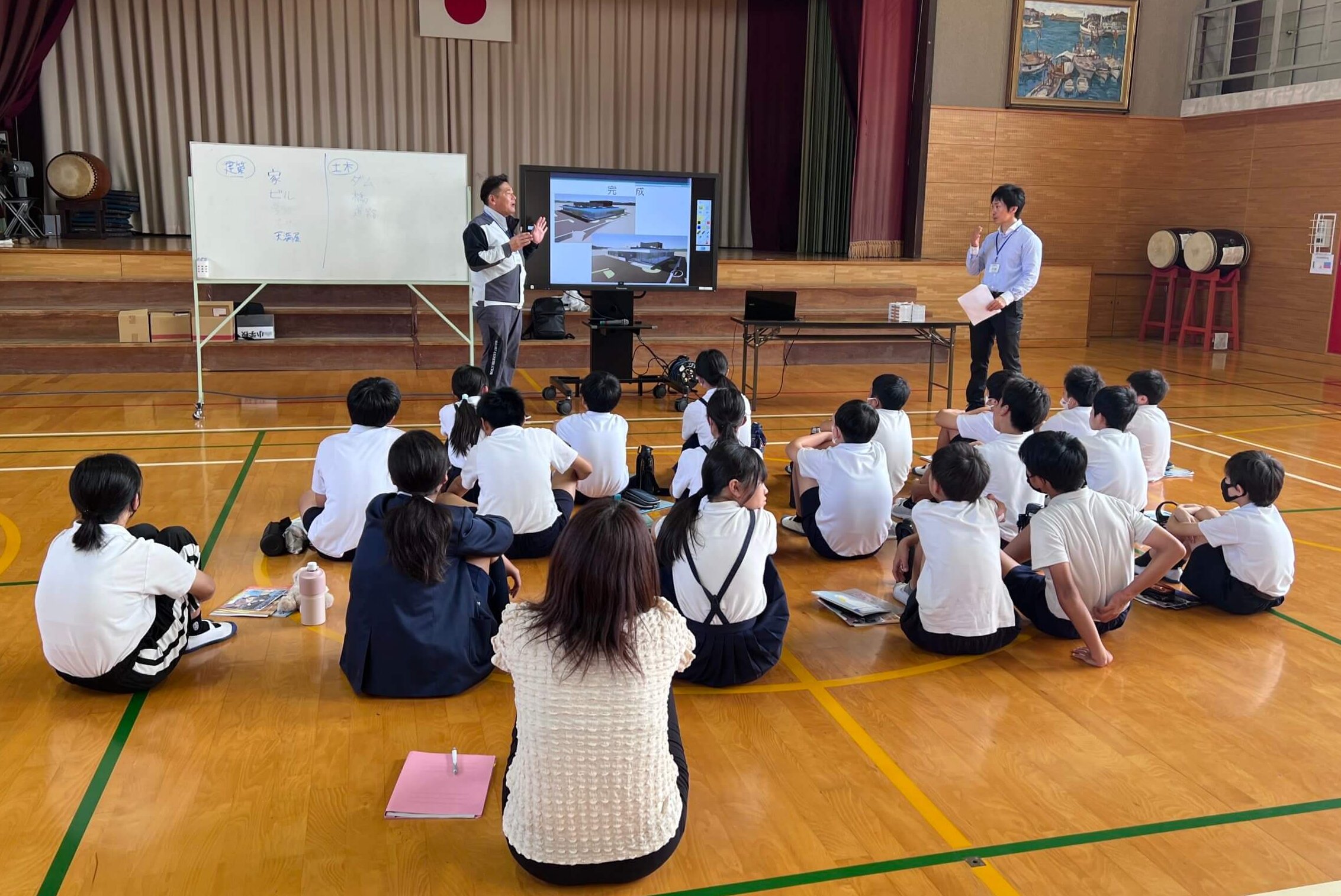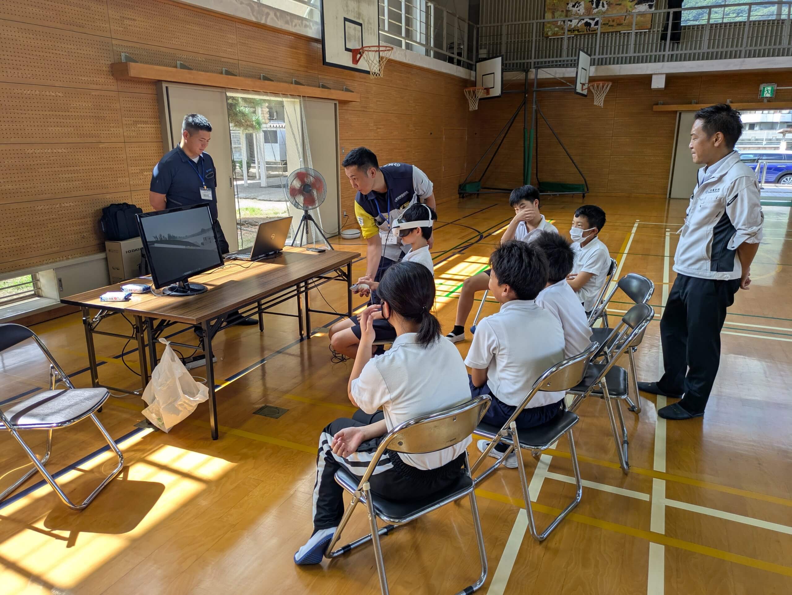 当日は午前中の体育館を貸し切り、座学と体験を行う楽しい会になりました。座学ではクイズを交えた建設業に関するお話。体験ではAR体験、VR体験、砂防堰堤模型実験を行いました。特にAR体験、VR体験は「ゲームみたいで楽しい」と好評で限られた機器をみんなで順番に使いながら新しい技術に触れていただく事ができました。