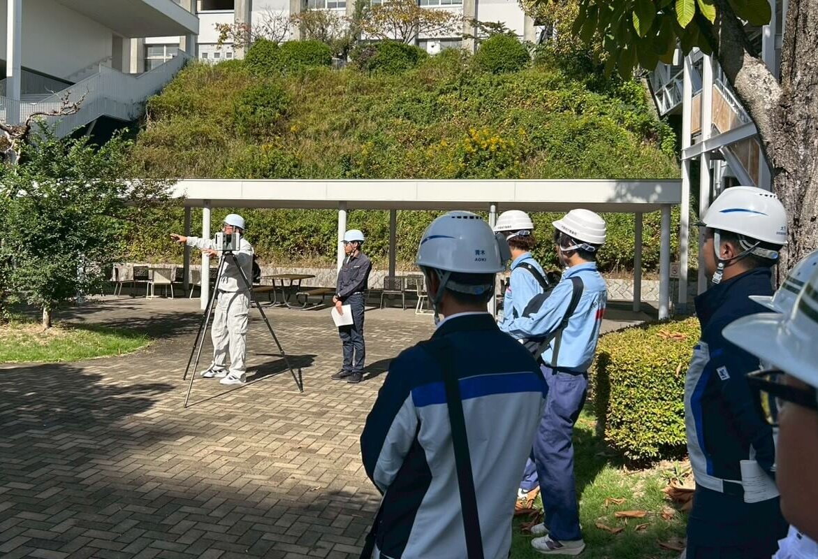 午前中の体験実習では9班に分かれ「鉄筋探査」「鉄筋組立」「3D測量」の3つの体験を行いました。その中で鉄筋探査や鉄筋組立に関しては時間や出来栄えによる採点方式を採用し、ただ体験するだけでなく内容についても競争を行いました。各班でチームメンバーが協力しながら作業を進める中で、それぞれの会話が弾み交流しやすい環境が生まれました。